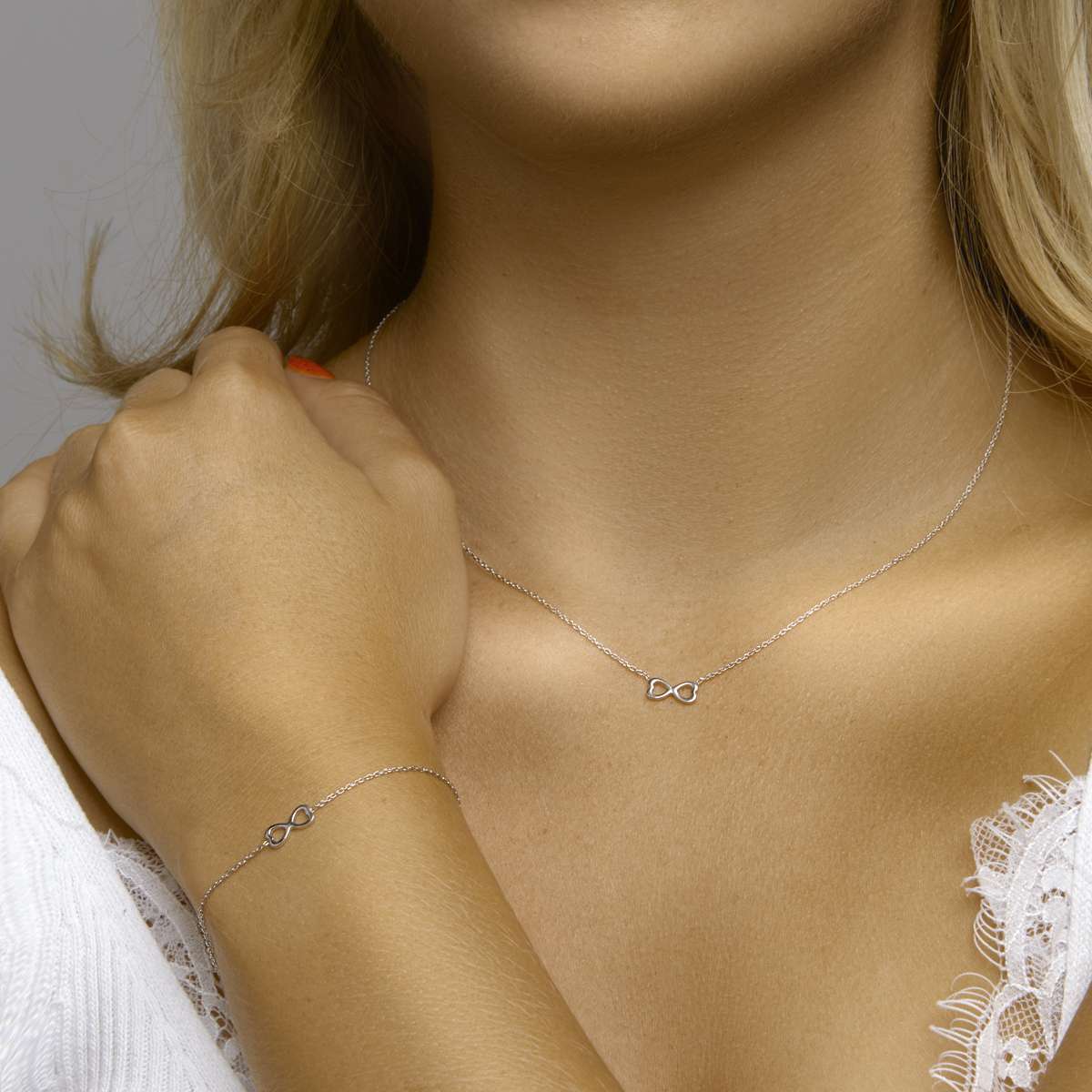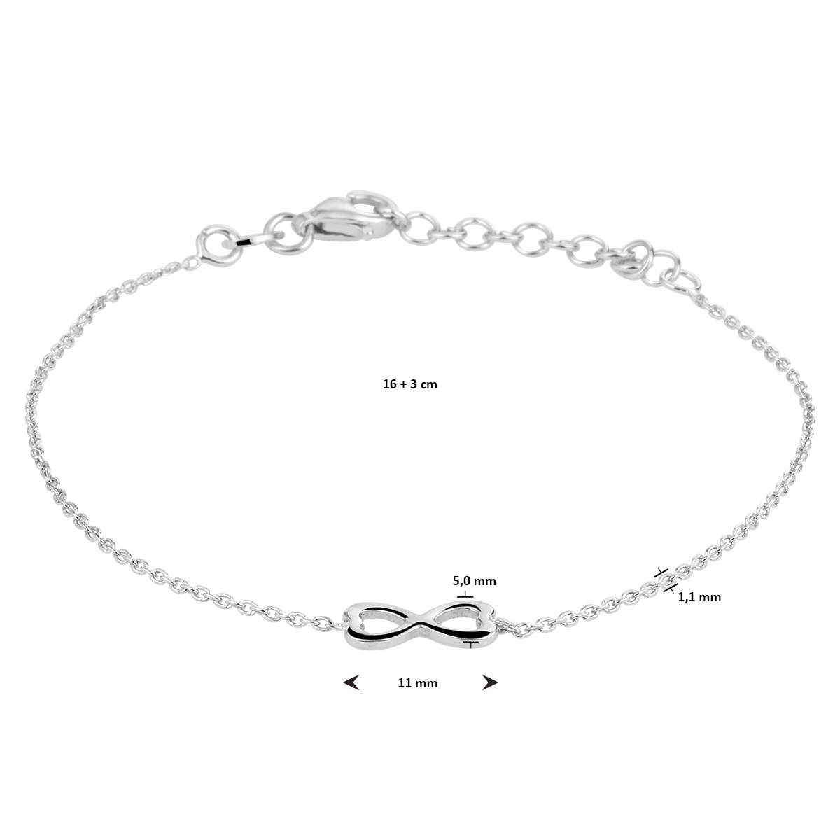 Gerhodineerd 925 zilveren armband uitgevoerd met een infinity teken en hartjes. De armband heeft een draaglengte van 16cm met een extensie van 3cm en een stevige karabijn sluiting. Het hangertje heeft een afmeting van 5x11mm.