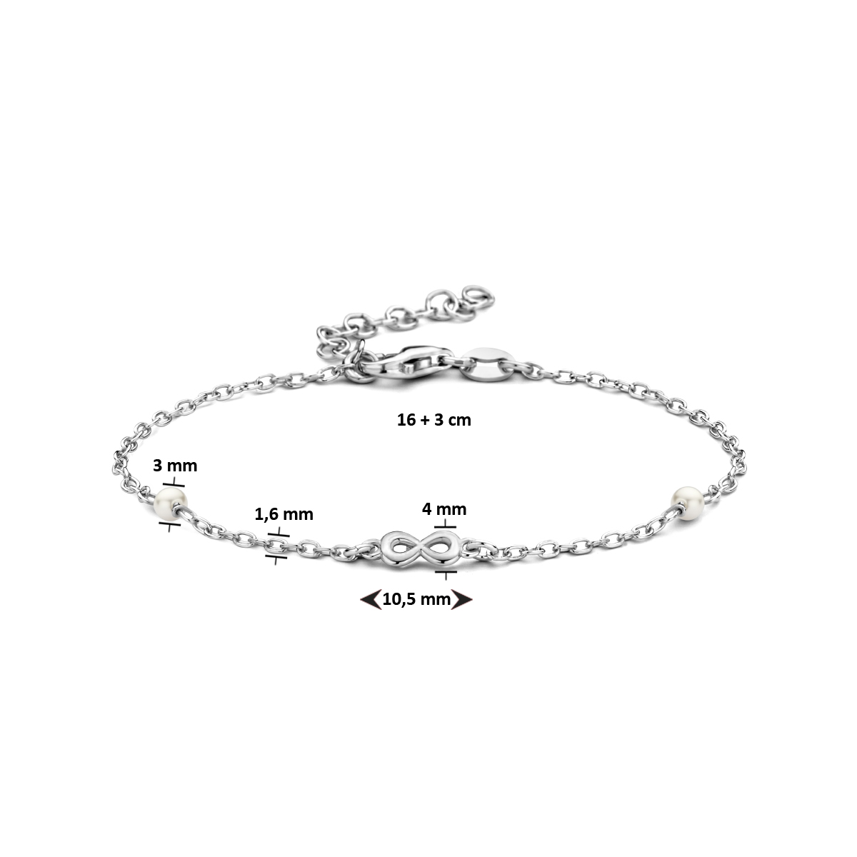 Gerhodineerd 925 zilveren armband uitgevoerd met een infinity hanger, synthetische parels en een karabijn sluiting. De armband heeft een draaglengte van 16cm met een extensie van 3cm. De schakelbreedte is 1.6mm.