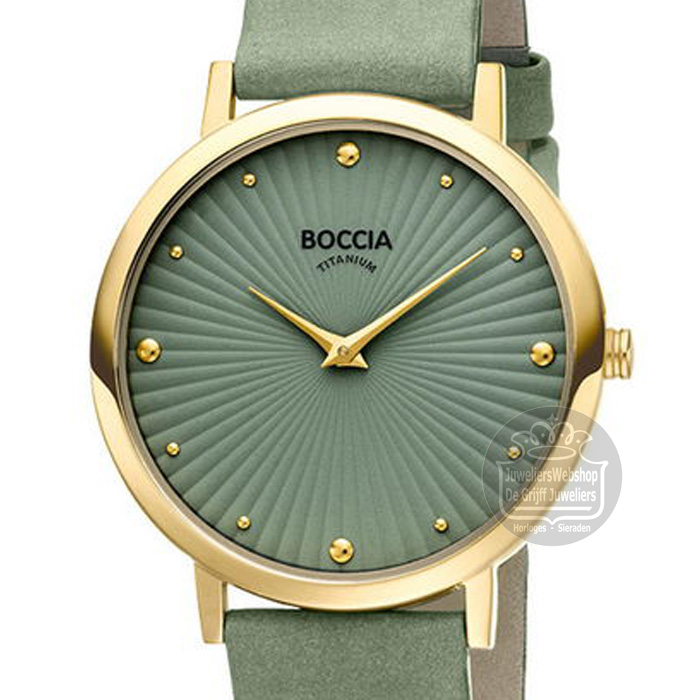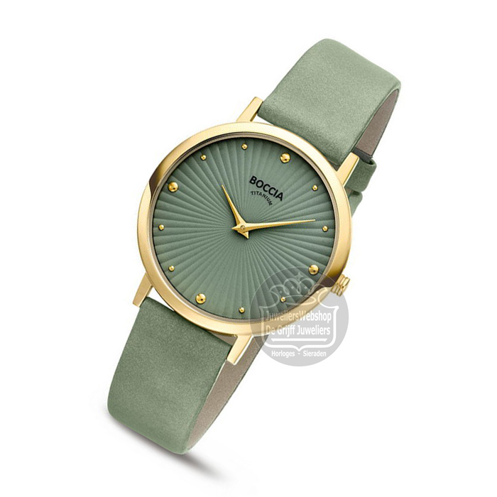 Dit dameshorloge van Boccia heeft een klassieke uitstraling. De 3365-04 heeft een ronde goudkleurige titanium horlogekast met een diameter van 34mm met een groene bewerkte wijzerplaat met een fijne uursaanduiding. Aan de titanium kast zit een groene lerenband met een gespsluiting. Het horloge heeft een mineraalglas en is 5ATM. Of je nu klassiek of chique gekleed gaat, dit horloge past bij elke outfit en iedere gelegenheid!