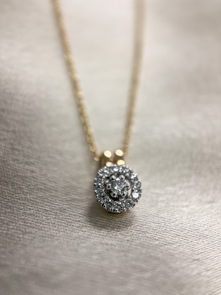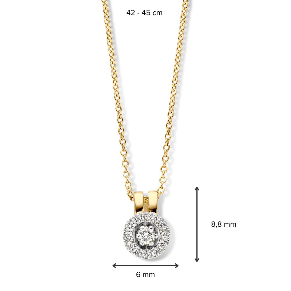 Diamanten entourage hanger aan een gouden ankerschakel.