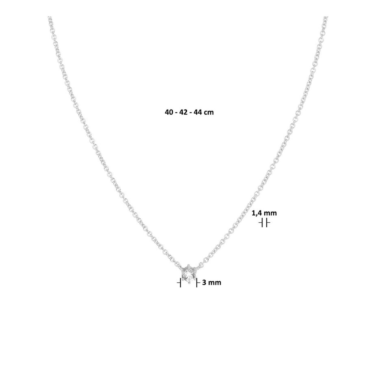 Gerhodineerd 925 zilveren collier uitgevoerd met een schitterende zirkonia en een stevige karabijn sluiting. Het collier heeft draaglengtes van 40, 42 en 44cm. De zirkonia heeft een diameter van 3mm.