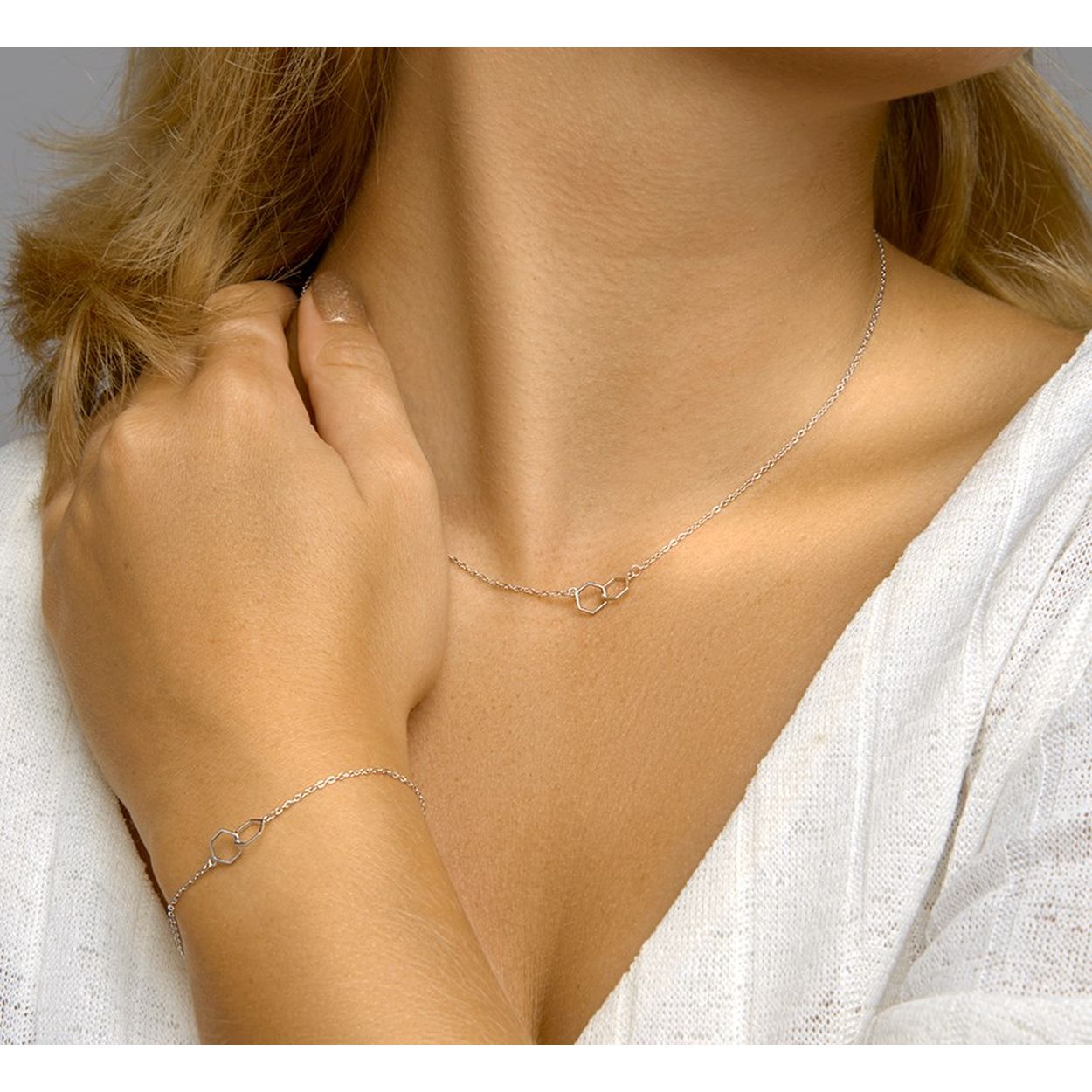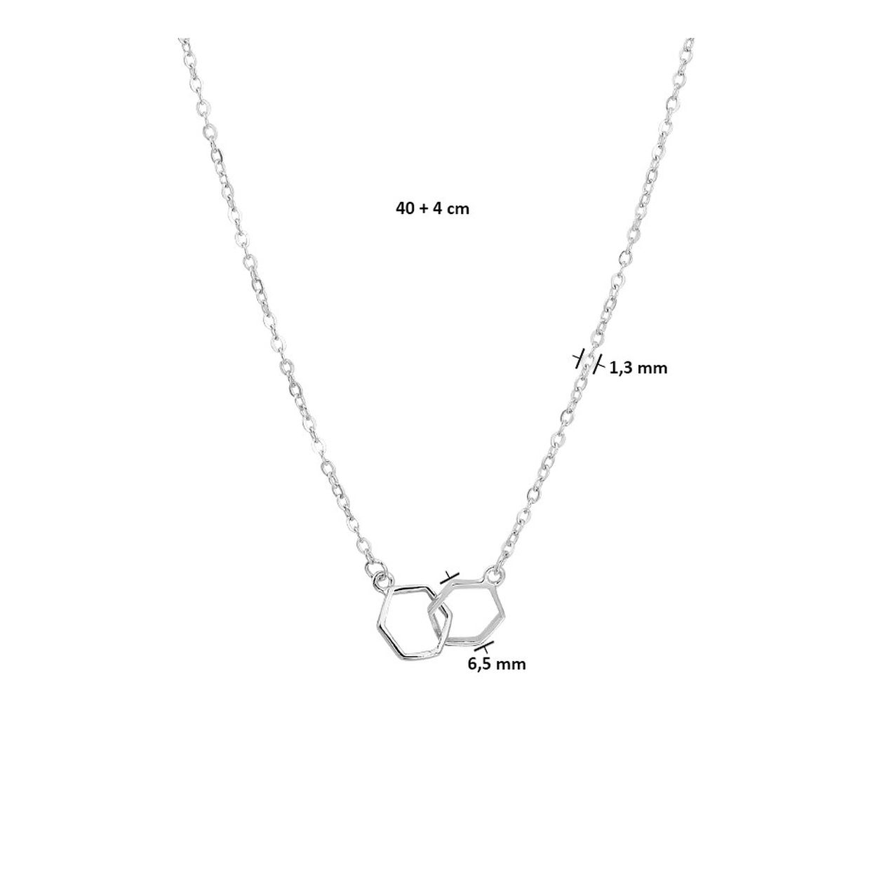 Gerhodineerd 925 zilveren collier uitgevoerd met twee zeshoeken. Het collier heeft een draaglengte van 40cm met een extensie van 4cm en een stevige karabijn sluiting. De zeshoeken hebben een hoogte van 6.5mm.