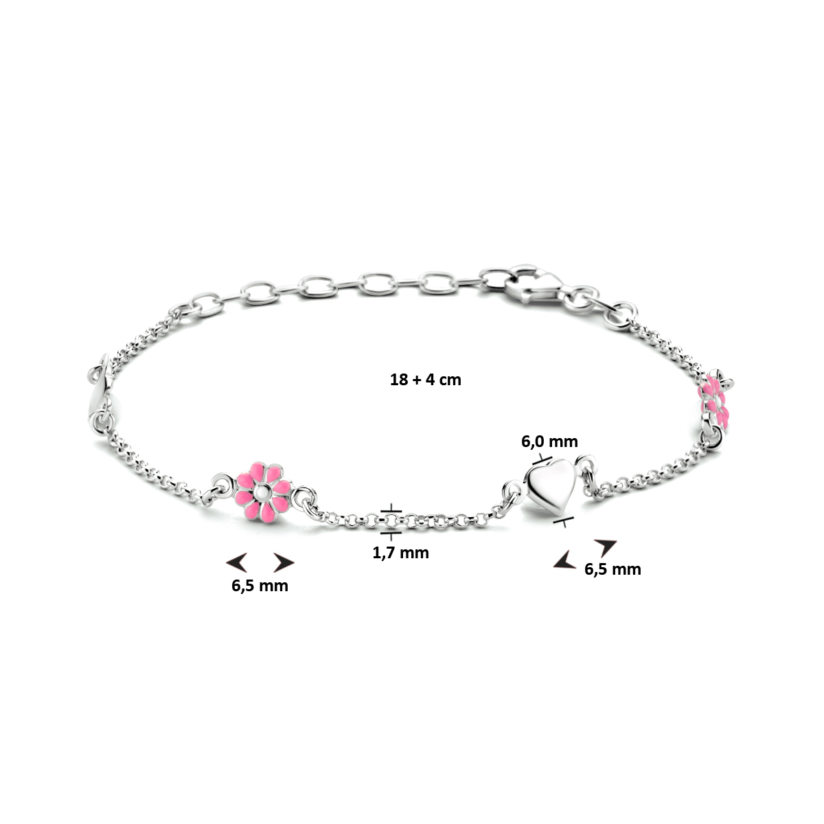 Gerhodineerd 925 zilveren enkelbandje uitgevoerd met een hartje en een bloemetje. Het enkelbandje heeft een draaglengte van 18cm met een extensie van 4cm en een stevige karabijn sluiting. De schakelbreedte is 1.7mm.