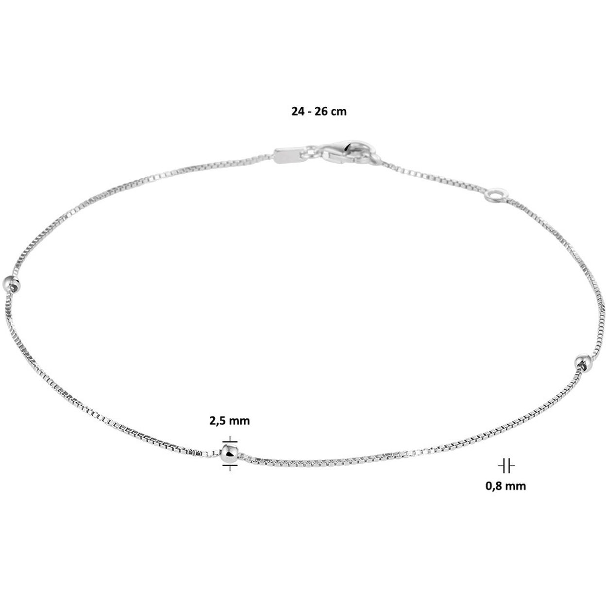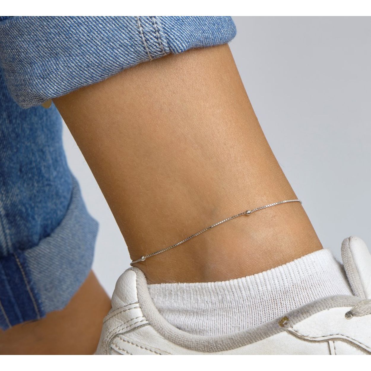 Gerhodineerd 925 zilveren enkelbandje uitgevoerd met bolletjes en een stevige karabijn sluiting. Het enkelbandje heeft draaglengtes van 24 en 26cm. De afmeting van de bolletjes is 2.5mm. Gerhodineerd zilver is door de rhodiumlaag beter bestand tegen verkleuren en krassen.