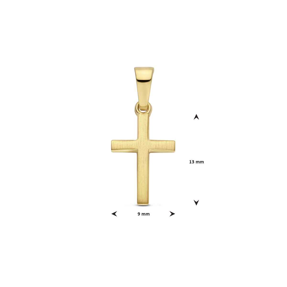 14k Geelgouden hanger in de vorm van een kruis. De hanger heeft een totale hoogte van 20mm en een afmeting van 13x9mm.