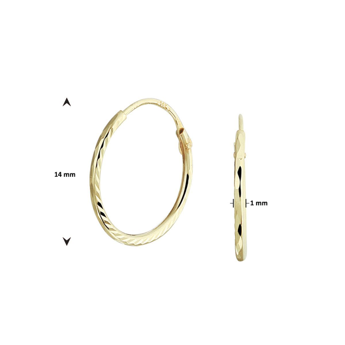 Geelgouden oorringen met een gediamanteerde afwerking en een diameter van 14mm. Minimalistisch design voor een exclusieve uitstraling. Tip: Combineer deze oorringen met bijpassende sieraden uit onze collectie of vanuit je eigen stash en creeer zo elke keer weer een nieuwe look.