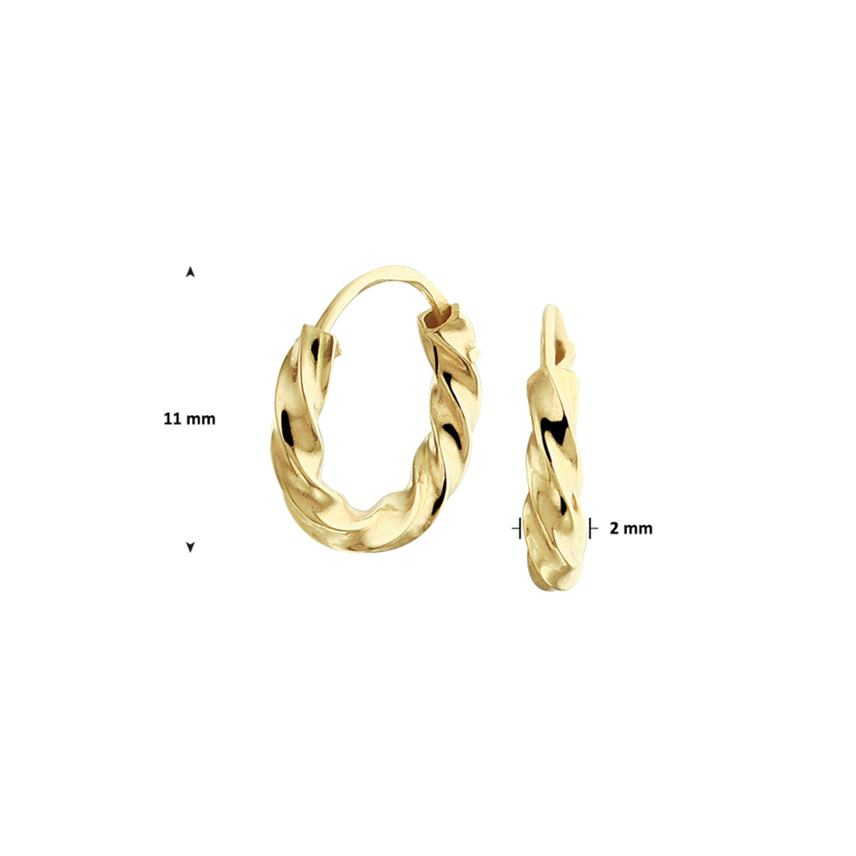 Klassieke geelgouden oorringen met een afmeting van 11x2mm uitgevoerd met een gedraaide buis. Door de eenvoud en het verfijnde ontwerp kunnen deze oorringen perfect worden gedragen met andere sieraden.