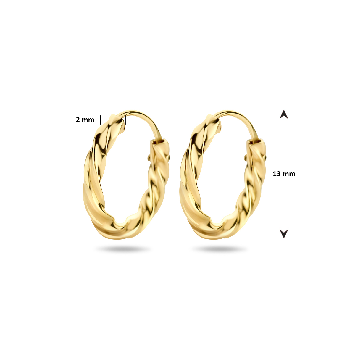 Klassieke geelgouden oorringen met een afmeting van 13x2mm uitgevoerd met een gedraaide buis. Door de eenvoud en het verfijnde ontwerp kunnen deze oorringen perfect worden gedragen met andere sieraden.
