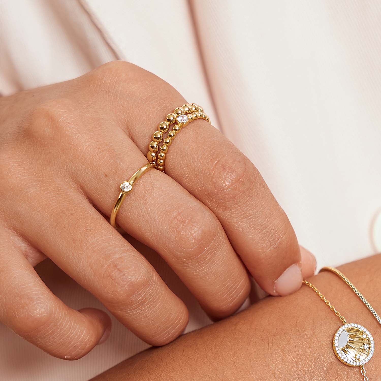 Je zult zeker verliefd worden op onze sierlijke ring. Deze ring is gemaakt van meerdere bollen die met elkaar verbonden zijn en heeft een zirkonia in het midden van een band van 14kt verguld sterlingzilver. Stapel hem op met die van jou en pas moeiteloos bij je dagelijkse looks.