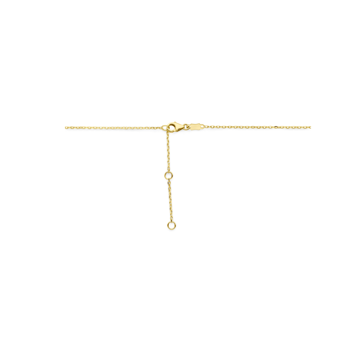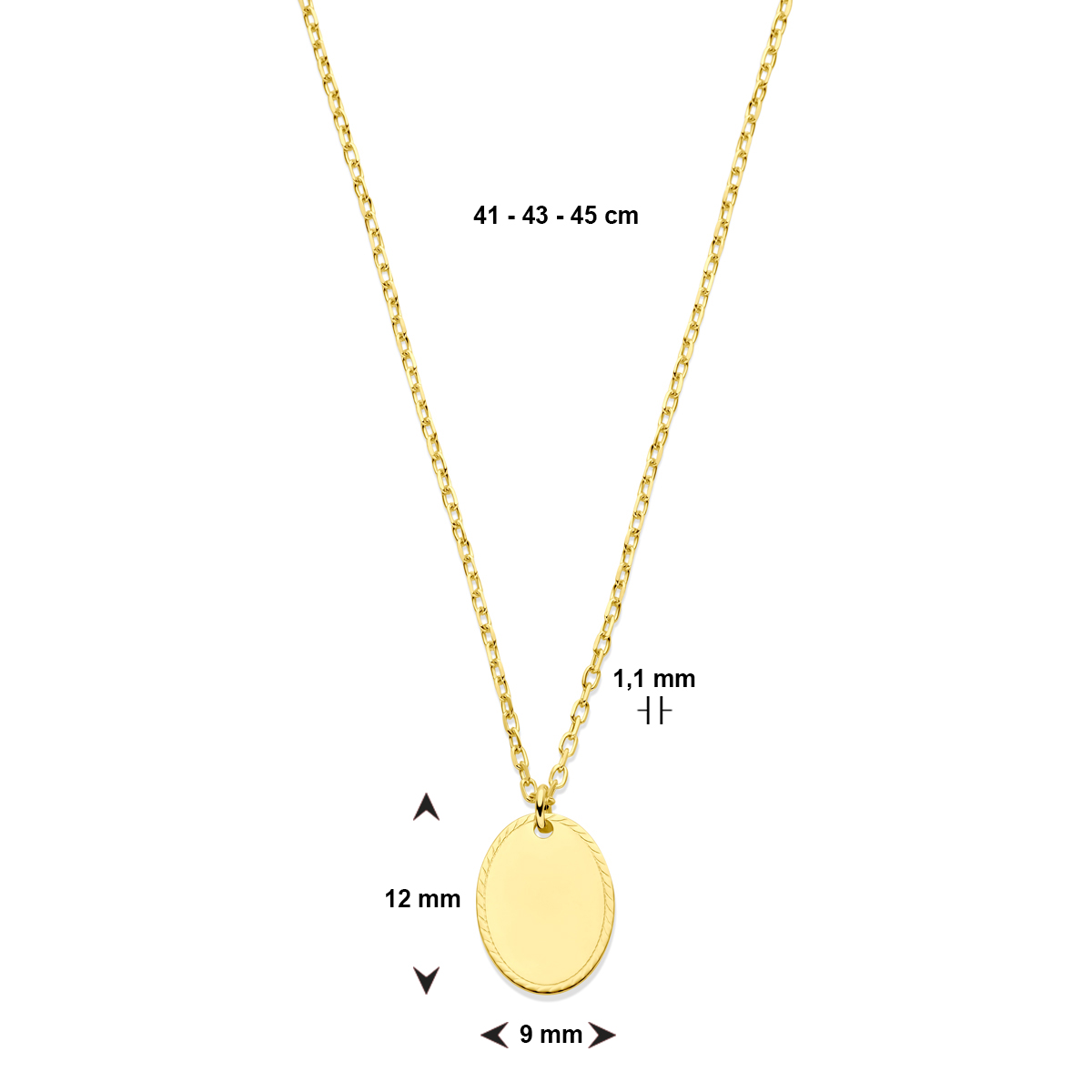 14k Geelgouden collier uitgevoerd met een graveerhanger en een karabijn sluiting. Het collier heeft draaglengtes van 41-43-45cm.