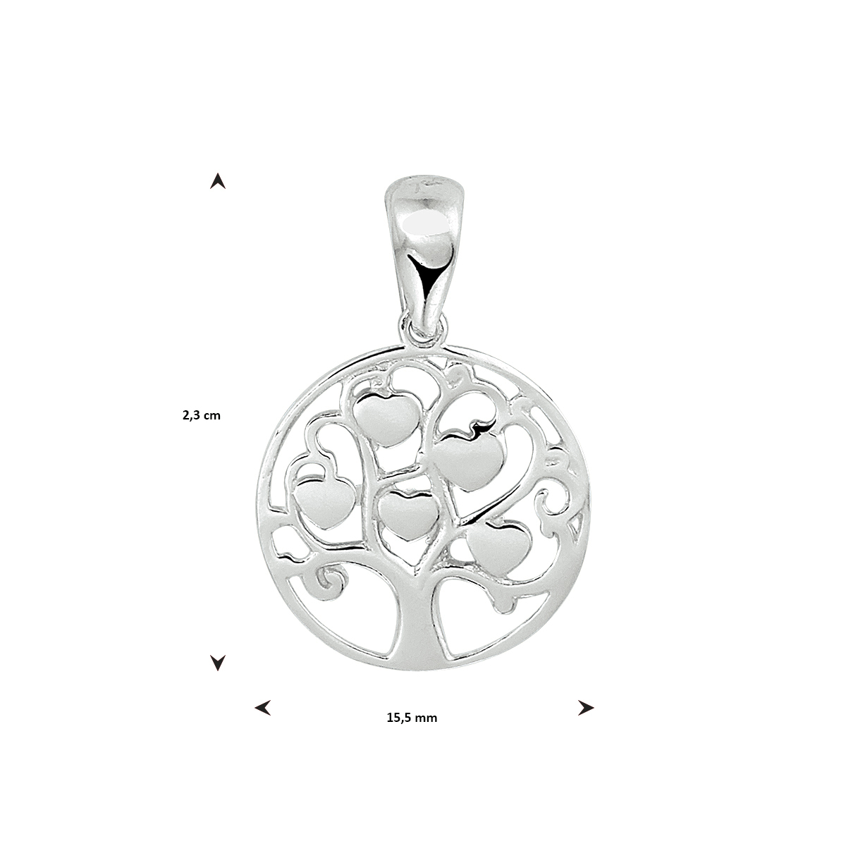 Gerhodineerd 925 zilveren hanger uitgevoerd met een levensboom en hartjes. De hanger heeft een totale hoogte van 2.3cm en een breedte van 15.5mm.