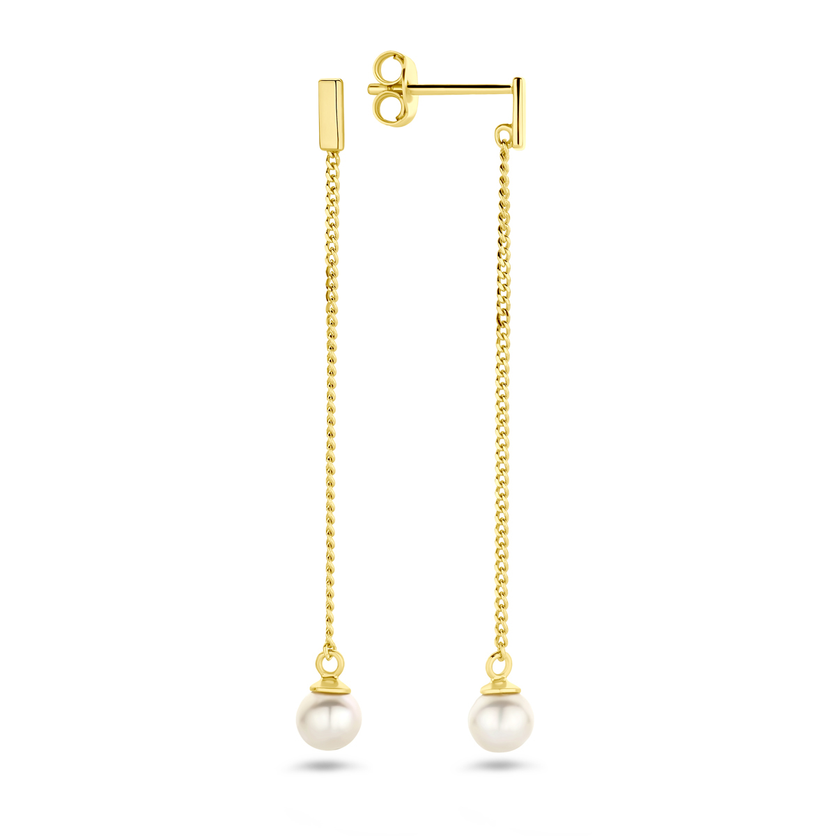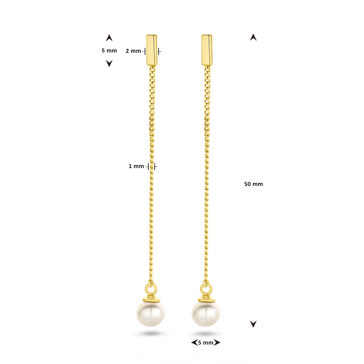 Geelgoud op 925 zilveren oorhangers uitgevoerd met zoetwaterparels. De oorhangers hebben een totale hoogte van 50mm. Geen garantie op de plating.