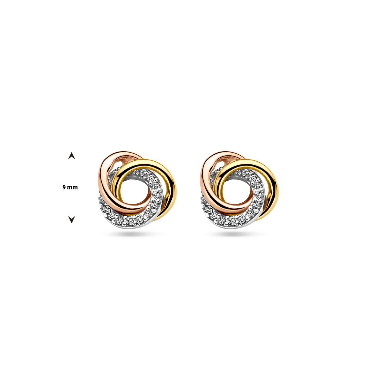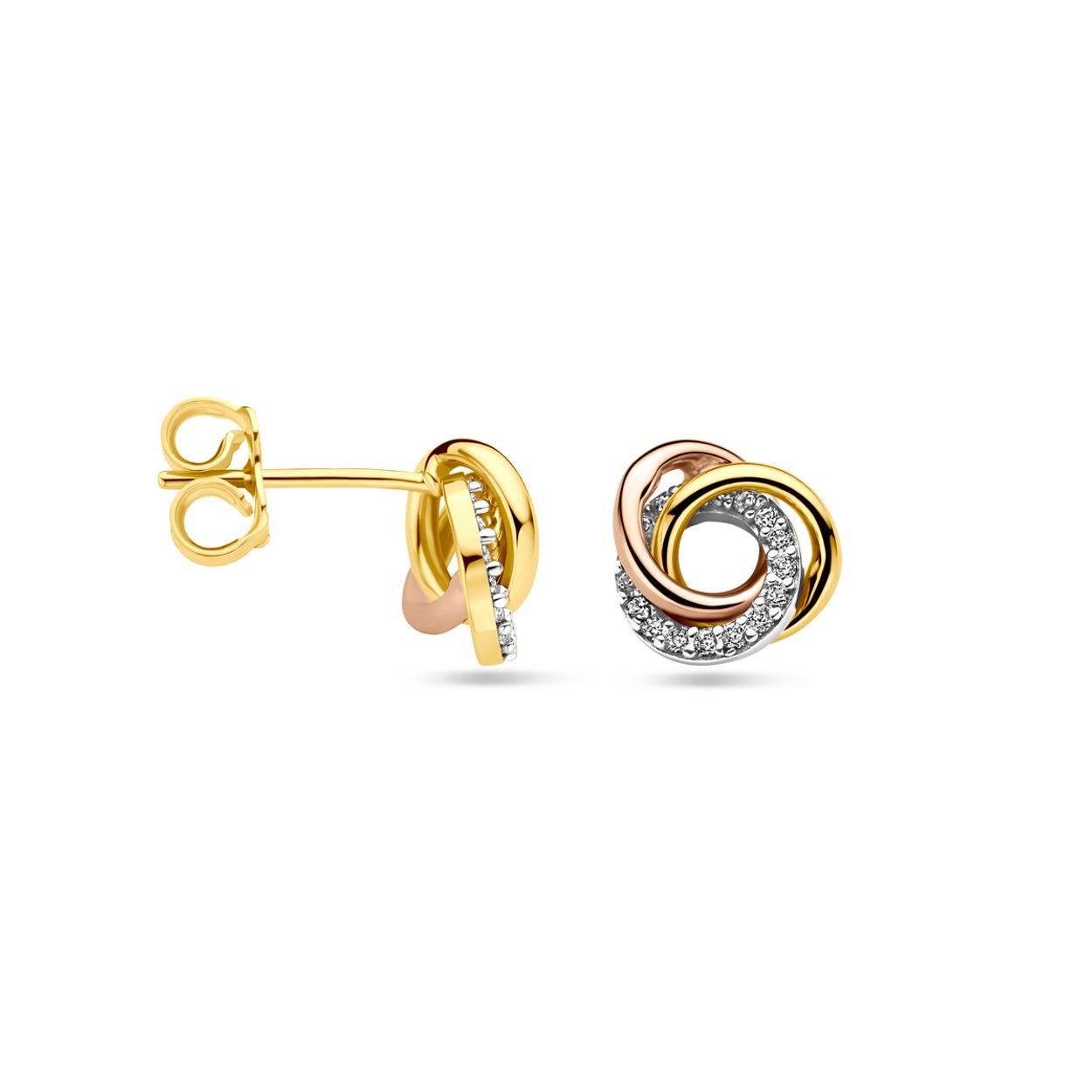 14k Tricolor wit- rosé- en geelgouden oorknoppen uitgevoerd met zirkonia. De oorknoppen hebben een diameter van 9mm.