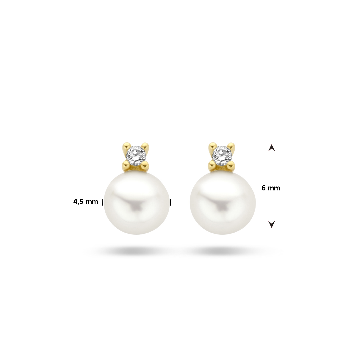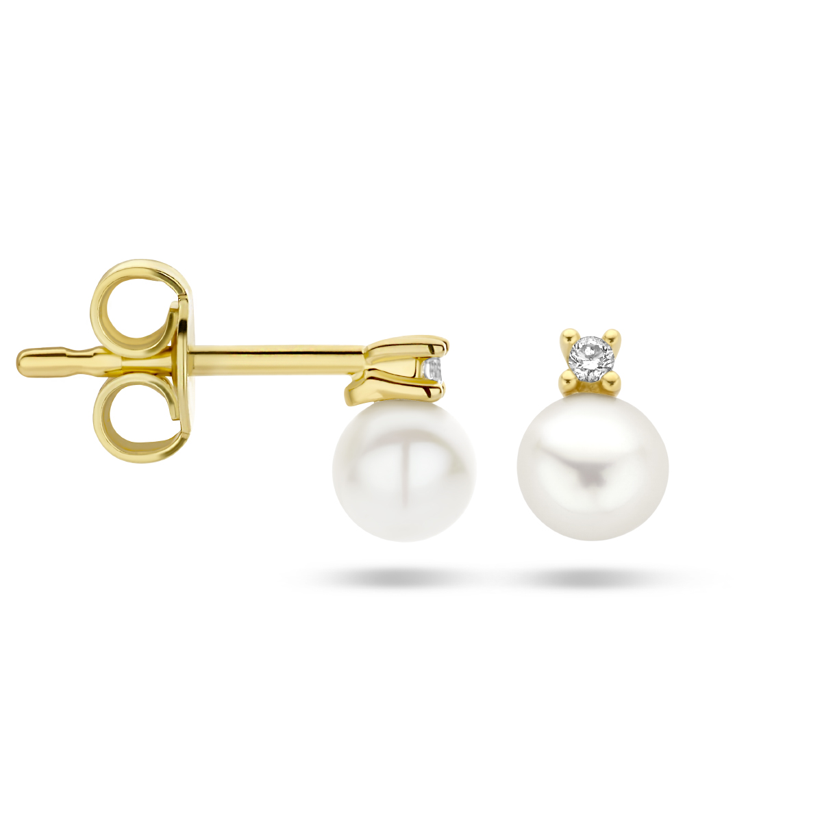 14k Geelgouden oorknoppen uitgevoerd met schitterende diamant en zoetwaterparels. De oorknoppen hebben een een diameter van 6mm. De diamant heeft een steengewicht van 0.02ct (2x 0.01ct).