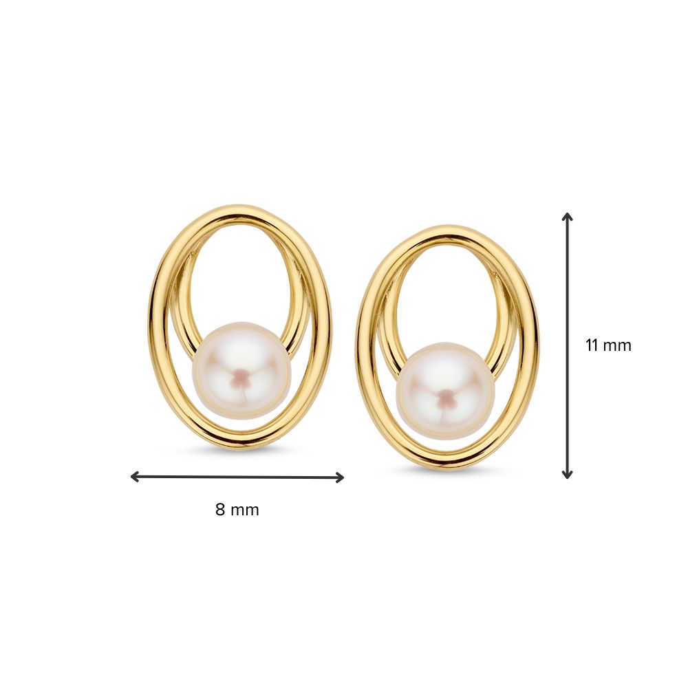 Geelgouden oorstekers met parels geplaatst in een speels ontwerp.