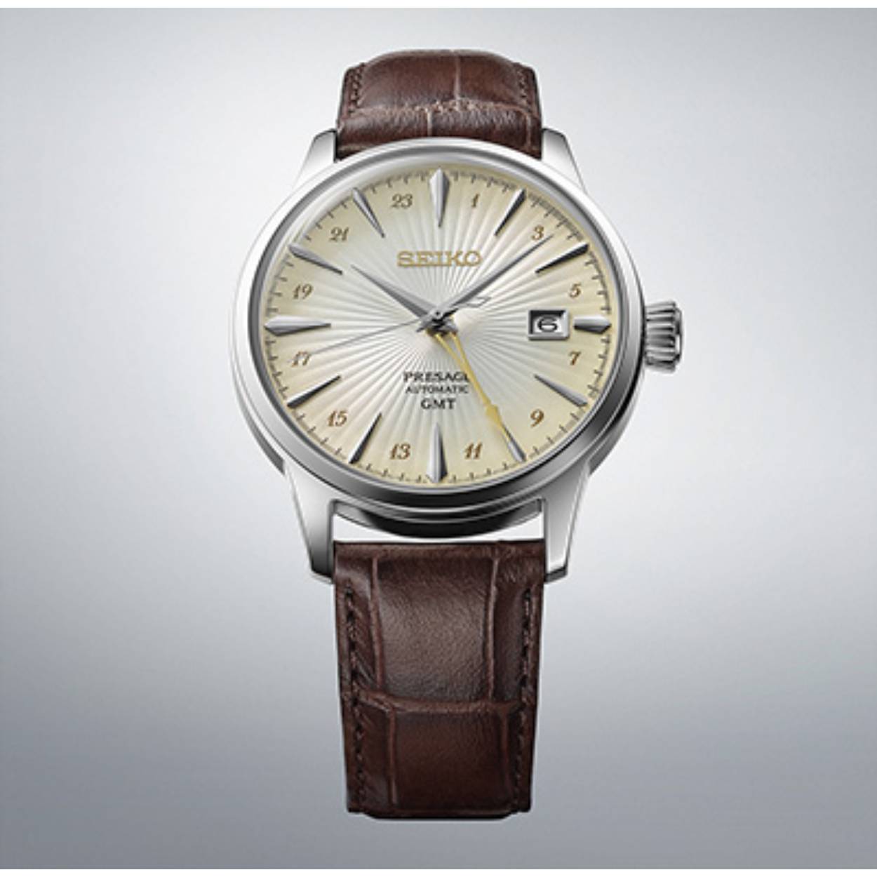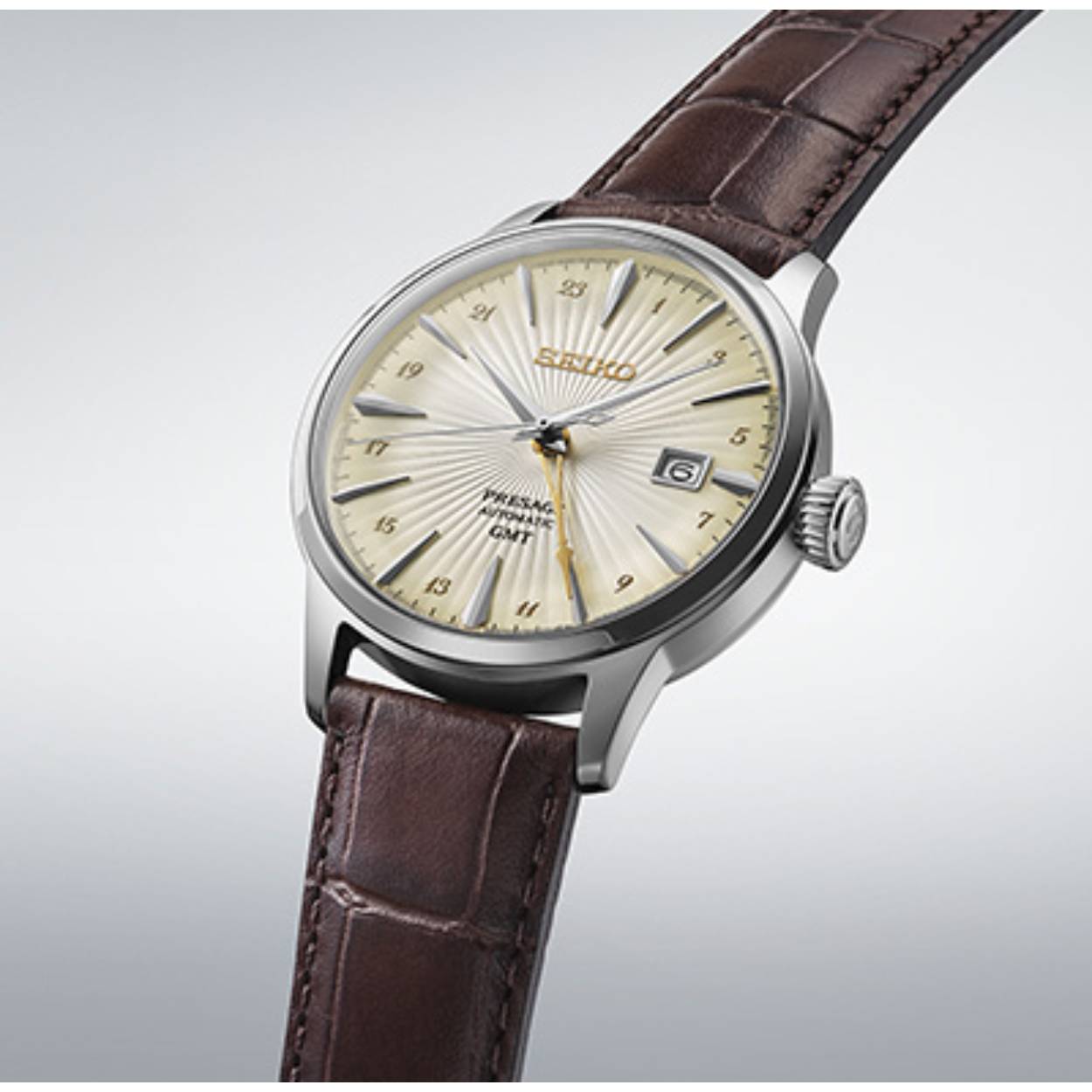 Dit horloge maakt deel uit van een nieuw trio Seiko horloges, Presage's eerste Cocktail Time-horloges met GMT-functie.