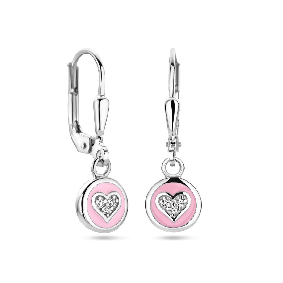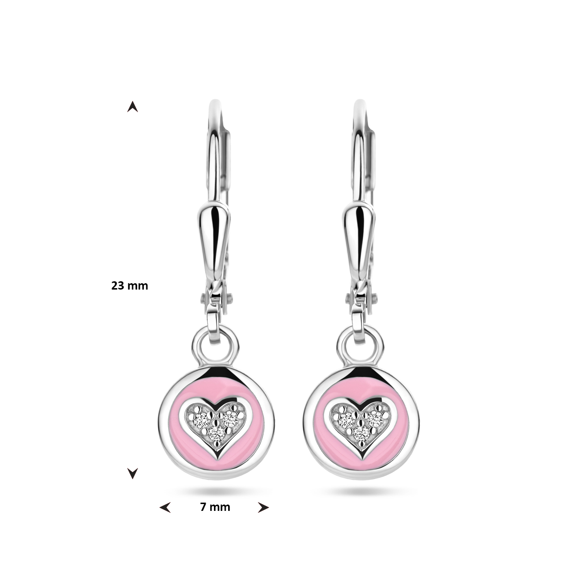 Gerhodineerd 925 zilveren oorhangers in de vorm van een cirkel van roze emaille met een hart van zirkonia.  De oorhangers hebben een totale hoogte van 23mm.